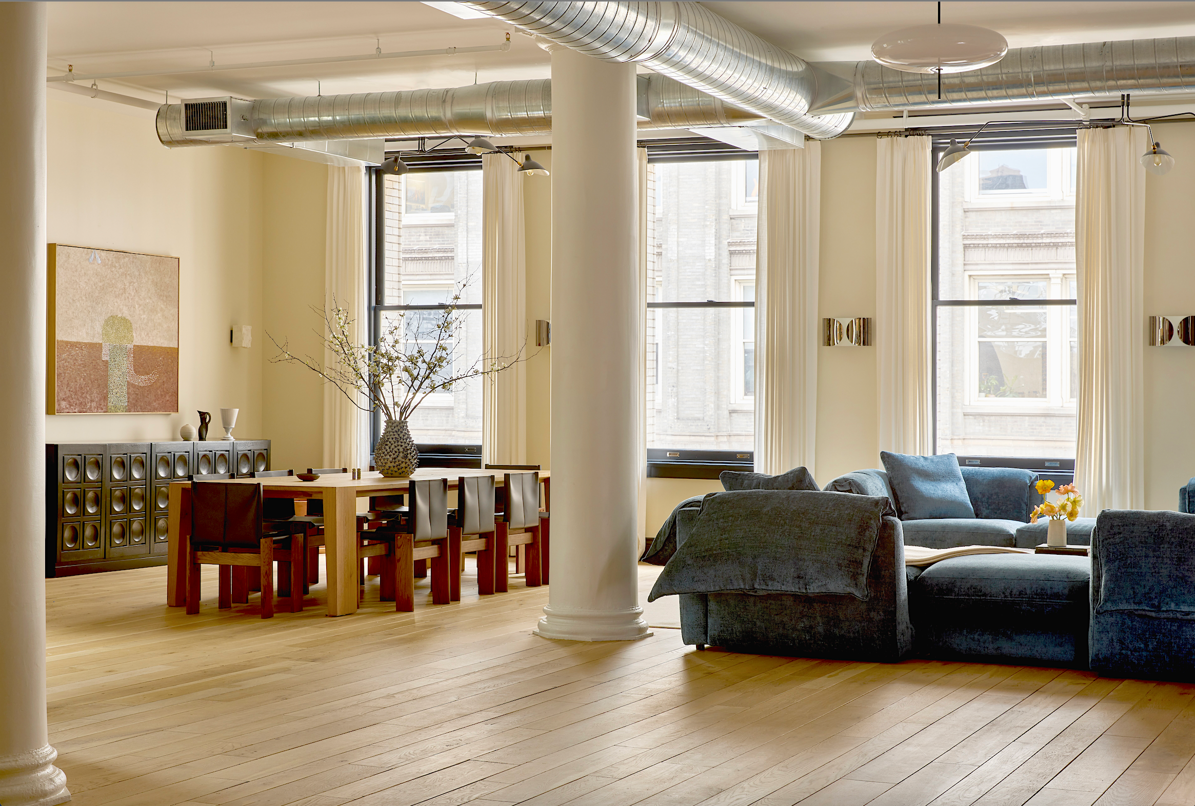 Spanning 4,678 square feet with four bedrooms and four and a half bathrooms, you enter directly from a private elevator into a sizable entry gallery with an adjoining walk-in closet with custom millwork. The loft’s main living space is expansive at over 2,000 square feet featuring original structural columns and industrial elements paired with reclaimed white oak flooring. 32 feet of oversized windows facing east and ceiling heights exceeding 11 feet allow for plentiful morning light and scale throughout. A wood-burning fireplace, clad in Italiano Marmorino, creates a natural sitting room with north-facing windows and classic Soho exposures. The oversized kitchen is exceptionally equipped, with custom cabinetry, striking marble countertops including a striking Rosso Levanto island, and professional-grade appliances by Wolf and Sub-Zero. A dedicated guest suite shares the home’s east-facing expanse, with a built-in murphy bed and en-suite bathroom offering added flexibility as a dedicated office. Storage is plentiful as well, with a walk-in pantry and additional adjacent service areas including an oversized laundry room and two additional storage rooms.